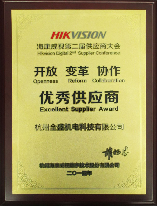 杭州全盛機電科技有限公司憑借卓越的品牌、快捷的交付、滿意的客服、高性價比的價格、穩(wěn)定的質量、優(yōu)質的產(chǎn)品位列榜首,榮獲杭州??低晹?shù)字技術股份有限公司2013年度“優(yōu)秀供應商”大獎。本次評選是??低暩鶕?jù)《供應商年度綜合評估方案及細則》,從供應商的品牌形象、綜合實力、產(chǎn)品品質、供貨及時性、現(xiàn)場配合以及售后服務等多方面進行的綜合評定,從400多家供應商中選出了11家優(yōu)秀供應商。