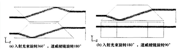 光纖滑環(huán)是實(shí)現(xiàn)旋轉(zhuǎn)端與固定端光信號(hào)連續(xù)傳輸?shù)臉屑~,是一種精密的光學(xué)傳輸器件,目前應(yīng)用的光纖滑環(huán)有單通道和多通道之分 ,單通道要求單路同軸對(duì)準(zhǔn),實(shí)現(xiàn)原理簡(jiǎn)單,多通道光纖滑環(huán)則需要通過光路折轉(zhuǎn)來實(shí)現(xiàn)光信號(hào)的連續(xù)傳輸 。 目前大多數(shù)多通道光纖滑環(huán)的實(shí)現(xiàn)原理都基于道威棱鏡 的光傳輸特性,如圖1所示,當(dāng)?shù)劳忡R自身轉(zhuǎn)速為輸入平行光束繞其轉(zhuǎn)軸旋轉(zhuǎn)轉(zhuǎn)速的一半時(shí),經(jīng)過道威棱鏡輸出的光束位置不變,因此只要保證2:1的傳動(dòng)關(guān)系,就可實(shí)現(xiàn)多路光信號(hào)的旋轉(zhuǎn)傳輸。
