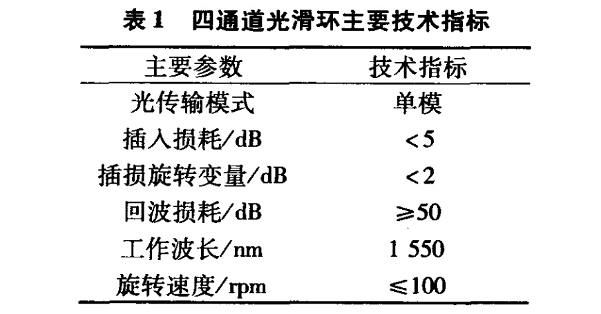本方案中的四通道光纖滑環(huán),經(jīng)試驗(yàn)驗(yàn)證,可以滿足軍品使用要求,其主要技術(shù)指標(biāo)見表 1,外形尺寸為∅88mm ×156mm,體積很小 。