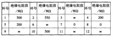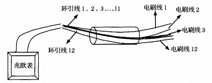 絕緣電阻檢測絕緣電阻是指在一定的電壓下各環(huán)路之間的絕緣電阻??捎?00V或250V兆歐表檢測。圖3為絕緣電阻檢測示意圖,將被測12路滑環(huán)的電刷線隔離放置,環(huán)引線(被測環(huán)路引線除外)并聯(lián)焊接一處。其中被測環(huán)路的環(huán)引線為一檢測端,其余并聯(lián)的環(huán)引線為另一檢測端,用500V或250V兆歐表測得當前電阻值。